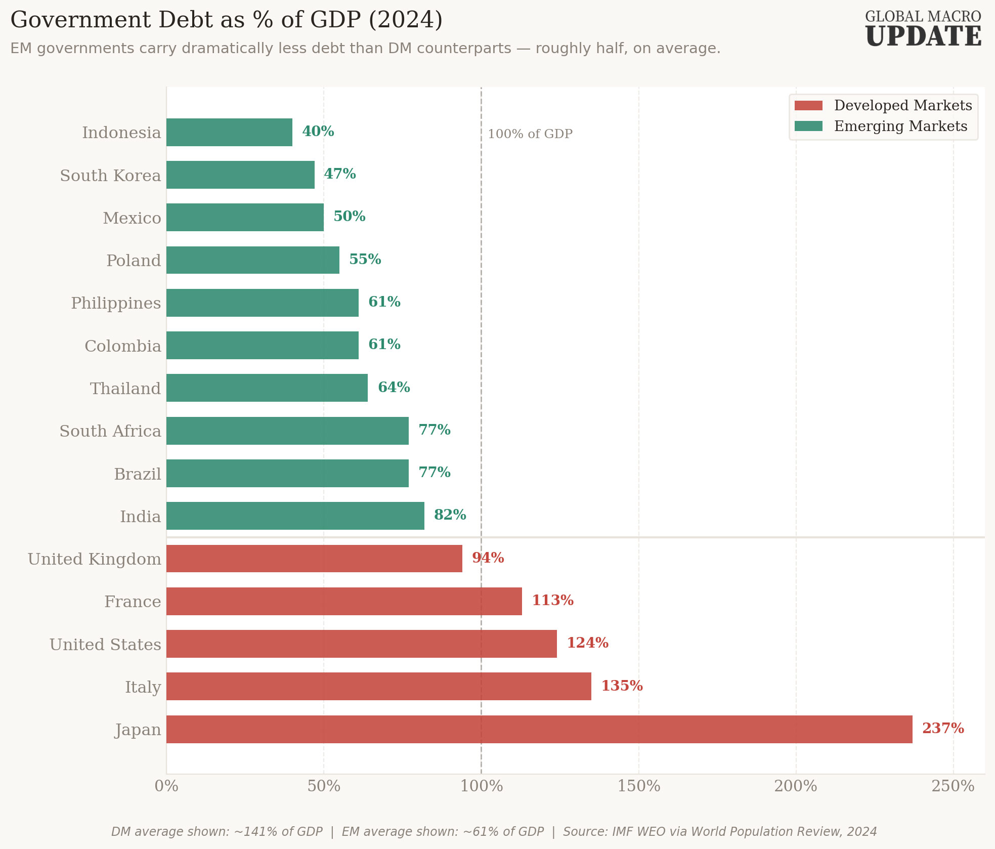 As Eric put it to me, “I don’t really know what else to say.” And frankly, neither do I. The deeper story is structural, not cyclical. Emerging market governments carry roughly half the debt loads of their developed market counterparts.