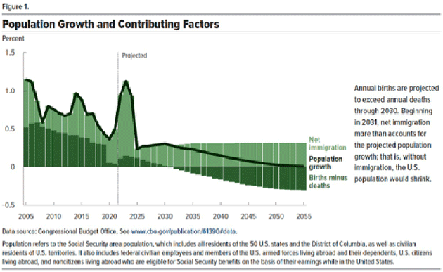Back in January the CBO noted that “without immigration, the population would shrink beginning in 2033, in part because fertility rates are projected to remain too low for a generation to replace itself.” Without immigration, the CBO now expects the US population to start shrinking in 2031.