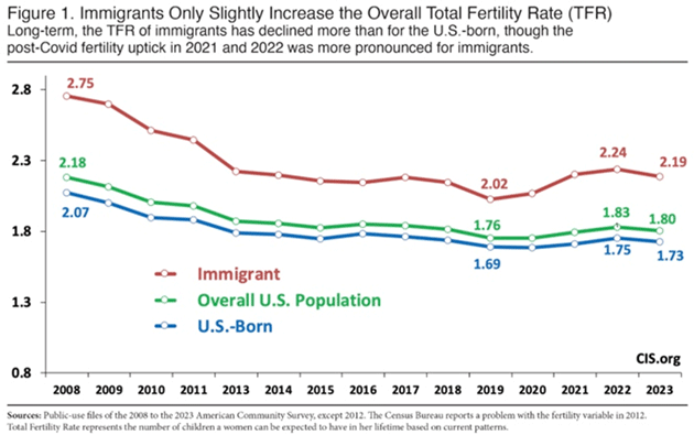 Part of this comes down to immigrants having more children than US-born Americans. Not a lot more, according to this 2023 data from the Census Bureau’s American Community Survey—but enough that immigrants land above the replacement rate, while US-born Americans fall below it.